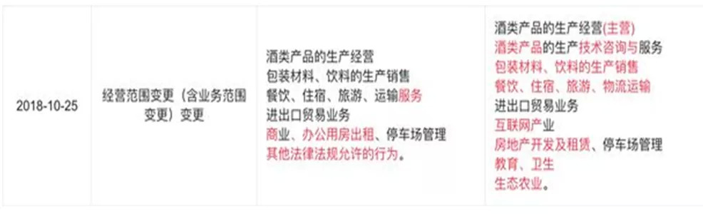 这是茅台集团官网的介绍,而经过企查查数据查询结果发现,在2018年茅台集团工商登记的经营范围发生了变化,新增了房地产、互联网、教育、生态农业等领域。