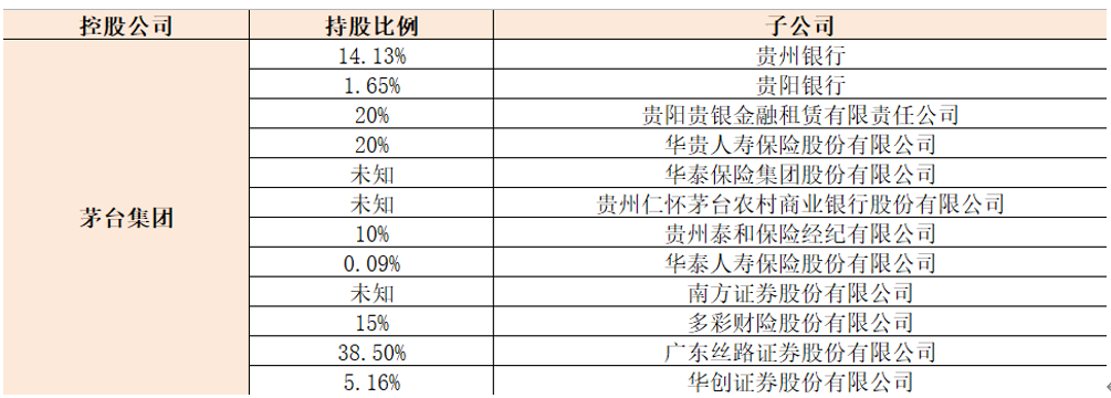 当下,茅台集团旗下金融业务已拥有财务公司、基金公司、租赁公司和华贵人寿保险4家金融公司,并投资参股贵州银行、贵阳银行、贵银金租、广东丝路证券等多家金融企业,同时成立了茅台集团金融控股公司。