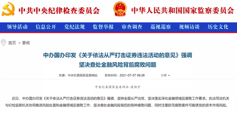 近日,中办国办印发《关于依法从严打击证券违法活动的意见》强调,坚持全面从严治党,坚决落实深化金融领域反腐败工作要求。执法司法机关与纪检监察机关协同推进风险处置和金融领域反腐败工作,坚决查处金融风险背后的各种腐败问题,同时注重防范腐败案件可能诱发的资本市场风险。