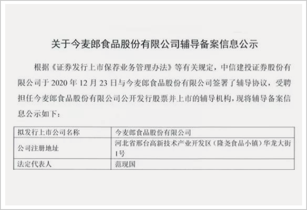2020年12月31日,河北证监局网站披露,今麦郎与中信建投于12月23日签署IPO辅导协议,正式冲击上市。