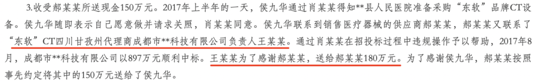 2021年5月21日,12309中国检察网披露的一份起诉书显示,2017年8月东软医疗代理商为了推广设备,在某县级医院招投标过程中行贿金额达180万元。
