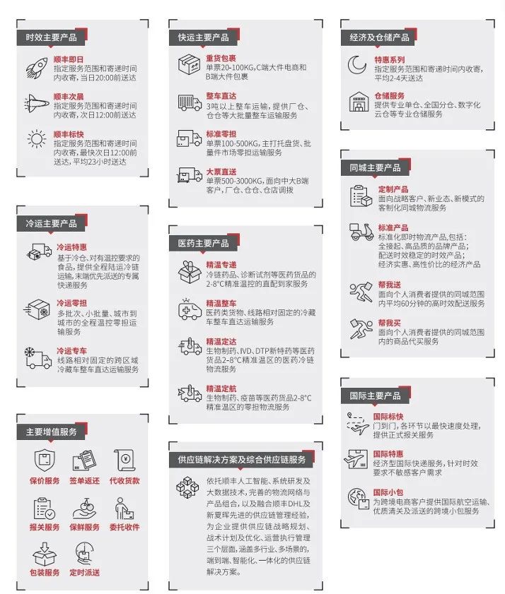 目前在运输业务上,顺丰的布局是:快递、快运、冷链医药、供应链、国际物流、同城急送等。