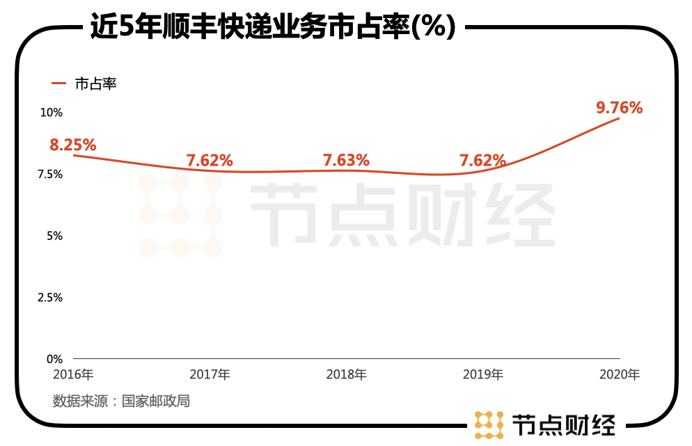 不过快递业务也并不能让顺丰高枕无忧。我们将顺丰快递业务的市占率拉长就能发现,其市占率一直是下滑的,从2014年的11%下滑到2019年的7.6%,2020年因为疫情+顺丰主打to c,才提高到了9.8%。