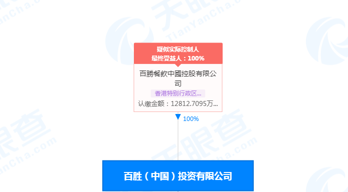 百胜(中国)投资有限公司成立于1999年6月,注册资本约1.28亿美元,经营范围包括从事餐饮、食品加工业、农业投资和畜牧业的投资等。股东信息显示,该公司由百胜餐饮中国控股有限公司全资持股。