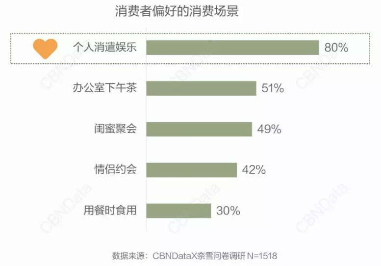 《2020新式茶饮白皮书》显示,新茶饮消费者偏好的消费场景中,“个人消遣娱乐”场景以80%占比排名第一,其余偏好场景依次是办公室下午茶、闺蜜聚会、情侣约会、用餐时食用等。对于新一代年轻消费者来说,新茶饮“在哪喝”“怎么喝”或许比“喝什么”更加重要。