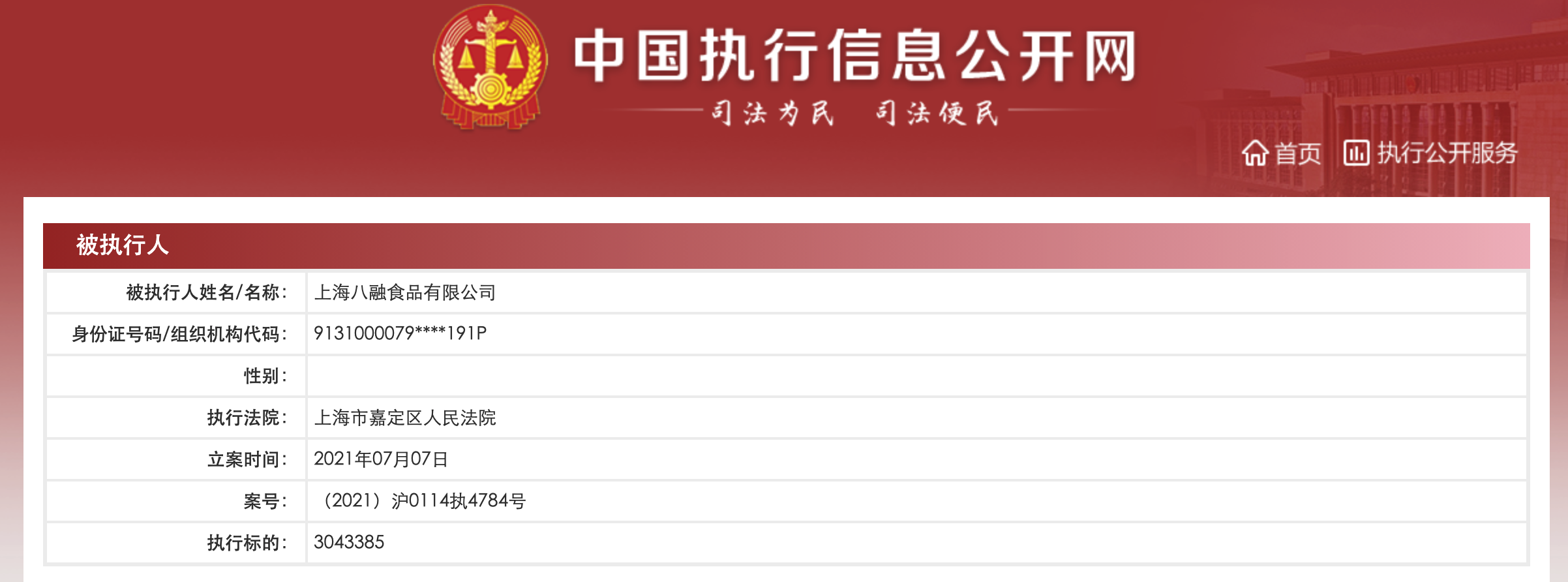 据天眼查APP显示,上海八融食品有限公司成立于2006年,注册资本255万美元,法定代表人蔡秉融。天眼查被执行人信息显示,目前该公司累计被执行金额超337万。此外,该公司还因有履行能力而拒不履行生效法律文书确定义务被上海市闵行区人民法院列为失信被执行人,且关联多条限制消费令和法律诉讼,多数案件涉及劳动争议和买卖合同纠纷。
