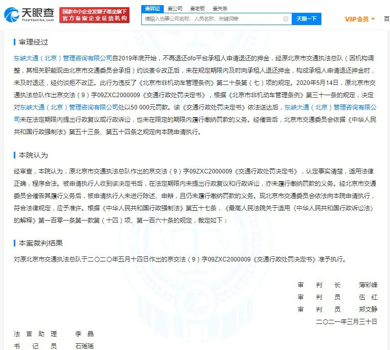 该判决内容显示,2020年,ofo公司被有关部门约谈责令改正后,仍未及时退还承租人押金。如今,法院判决强制执行ofo公司5万元罚款。