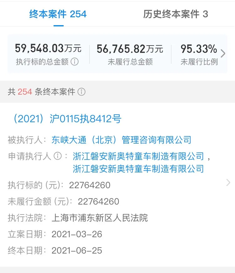 过去三年多时间中,东峡大通320余次列被为被执行人,40余次被列为失信被执行人。