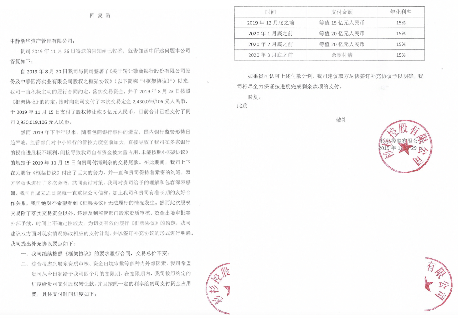 2019年8月20日,双方签署协议,杉杉控股按2018年6月30日每股净资产1.5倍、H股股价的近3倍的价格,以121.5亿总价收购中静新华所持徽商银行14.32%的股权,其中包括中静四海的51.62%股权、徽商银行2.2亿股内资股、以及12.45亿H股股份。当月,中静四海股东变更,杉杉集团成为全资股东。