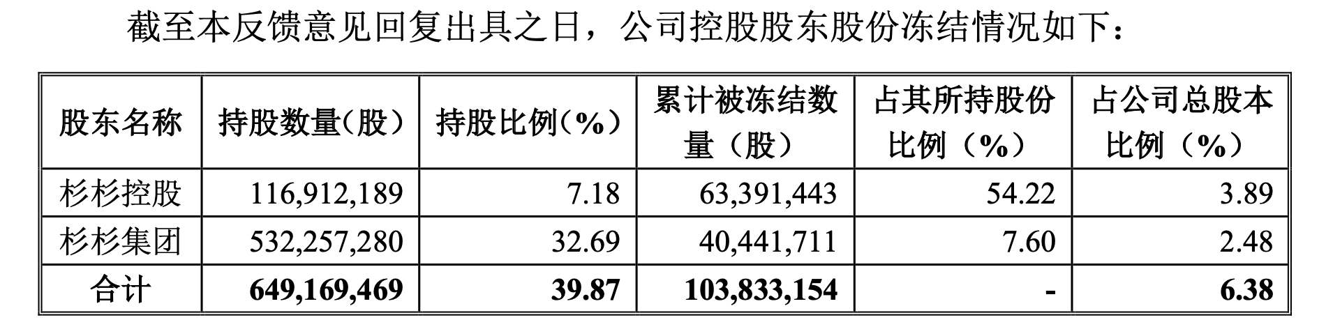 据近期为非公开发行A股申请反馈意见的回复,截至6月25日,杉杉控股及杉杉集团合计持有杉杉股份39.87%的股份,其中部分被冻结,占公司总股本的6.38%,司法冻结涉及与中静新华的纠纷。7日,杉杉股份收盘价24.97元,市值406亿元。