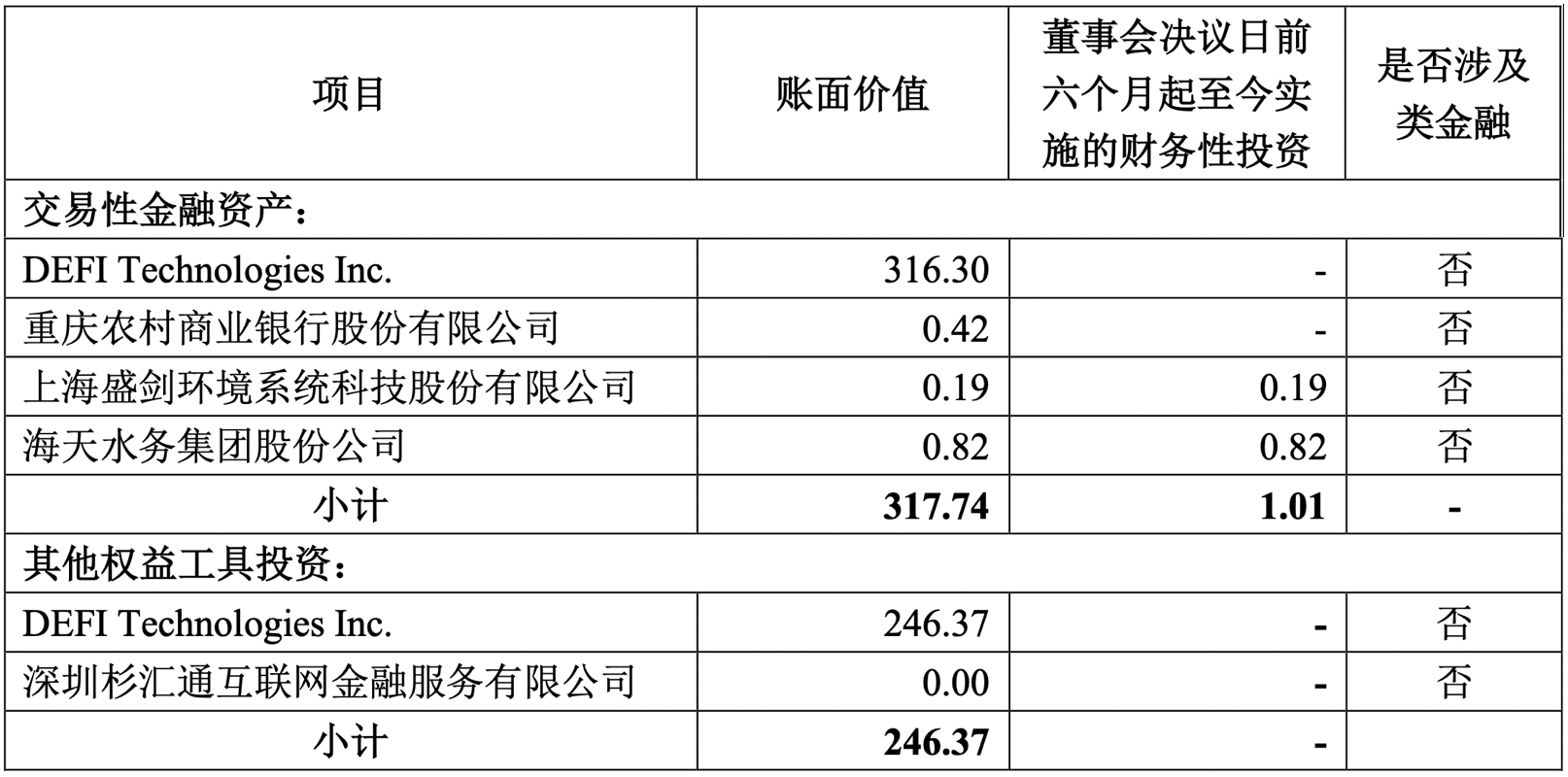 此外,文中提到,杉杉股份交易性金融资产除了渝农商行(601077.SH)还包括DEFI Technologies Inc.(NEO:DEFI)。回复提及,DEFI Technologies Inc.原本是一家加拿大矿产勘探公司,后转为一家金融服务公司。杉杉股份在2010年对其投资,介于该公司主营业务变更,将其认定为财务性投资。