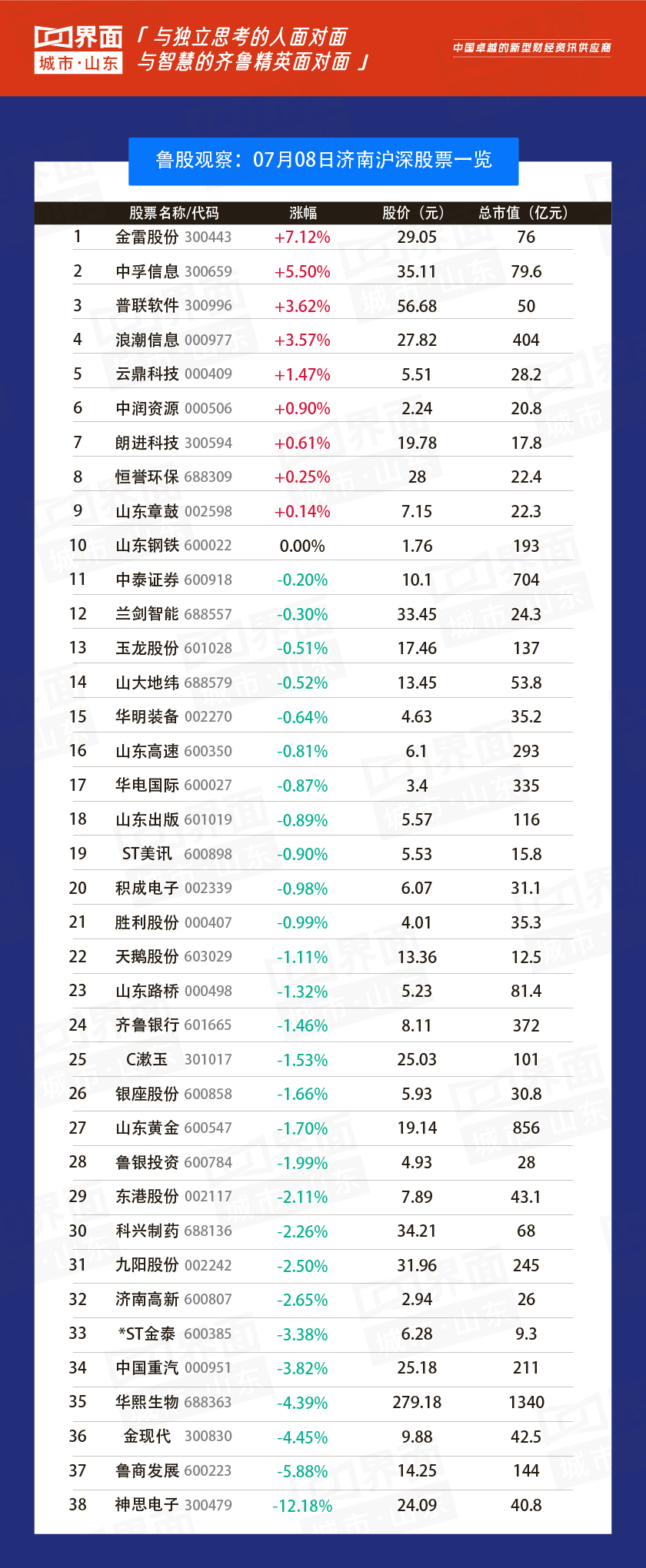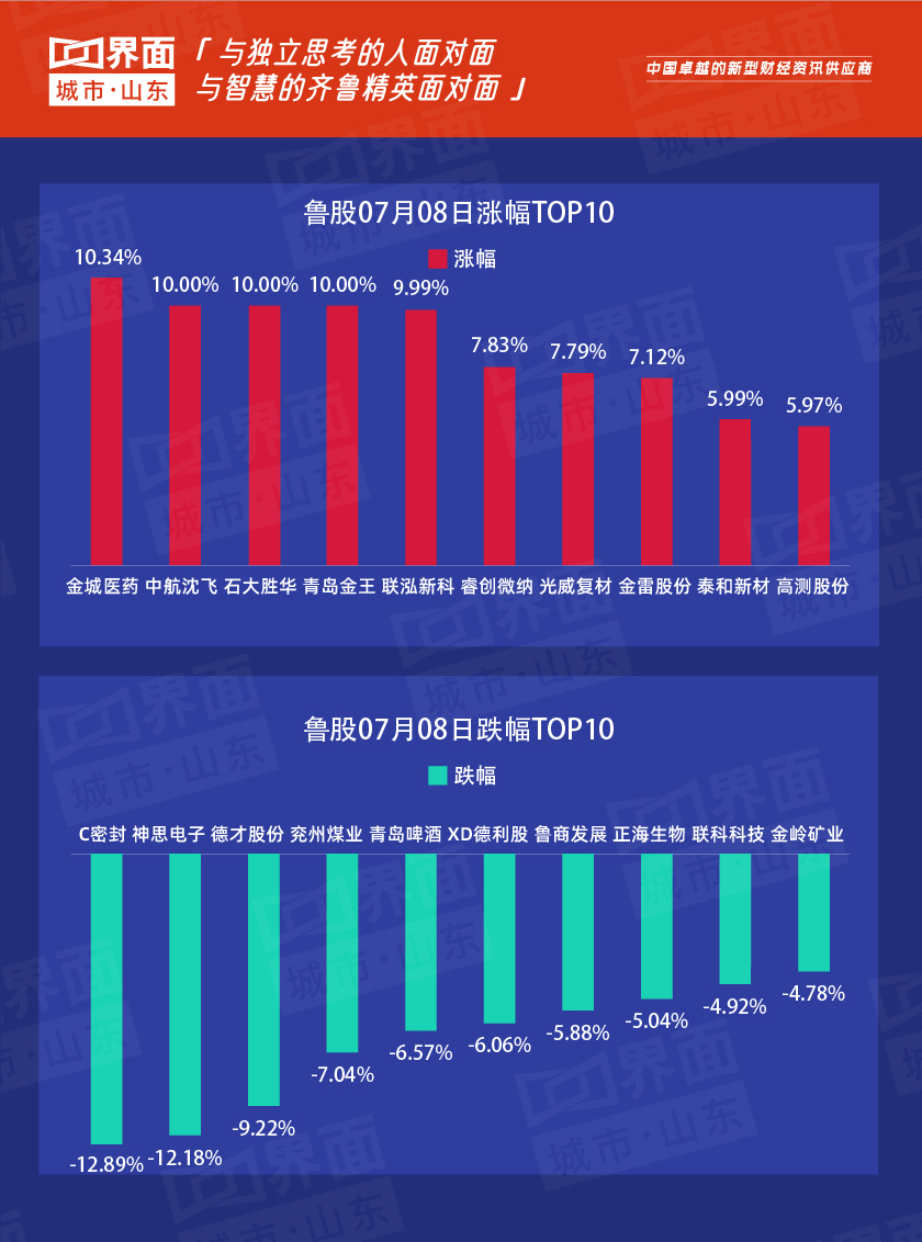 受大盘影响,7月8日,山东省内沪深股票有61只个股上涨,177只下跌,金城医药领涨。
