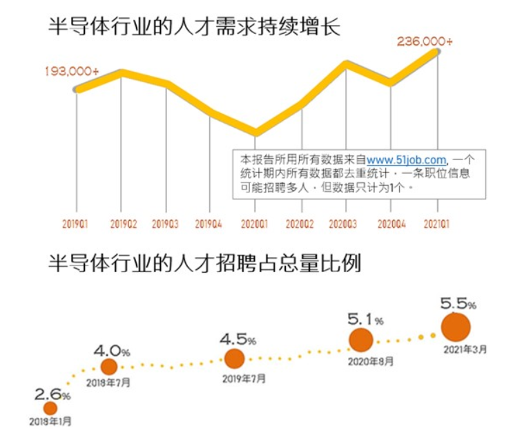 前程无忧此前发布的2021年一季度半导体人才供需报告指出,集成电路/半导体行业在过去三年保持增长。数据显示,2021年一季度的招聘量比2020年和2019年同期分别增长了65.3%和22.2%,并呈现出将进一步增长的态势。