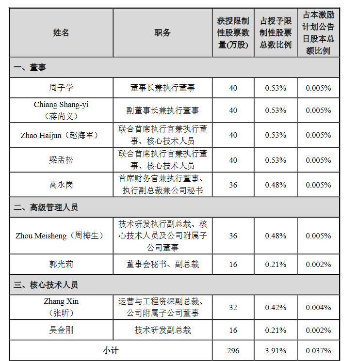 根据这期股权激励计划,吴金刚所获得的限制性股票数量和中芯国际董事会秘书、副总裁郭光莉一样,而另一位核心技术人员运营与工程资深副总裁、公司附属子公司董事张昕所获得的限制性股票数量是他的两倍。
