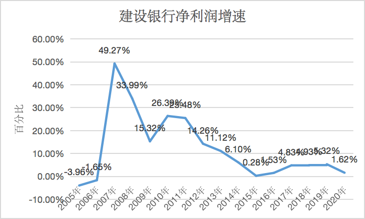 除了营收增长增速放缓,净利润增速建设银行也再次放缓,2005年—2015年年建设银行净利润最高增速达到49.27%,但在2015年以后银行净利润常年在4%徘徊。
