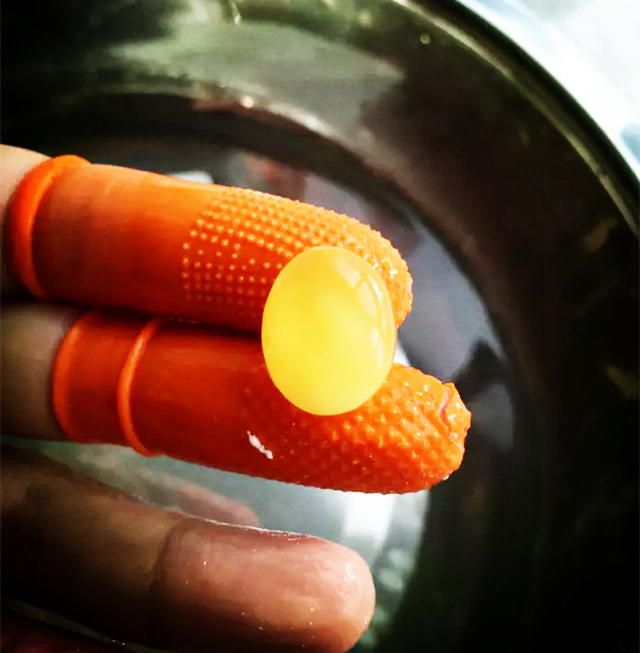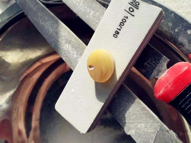 采用水砂纸或者打磨块,将之前定型的蜜蜡戒面,采用“去角”的方法,磨成球面,并进行第一次水磨抛光。