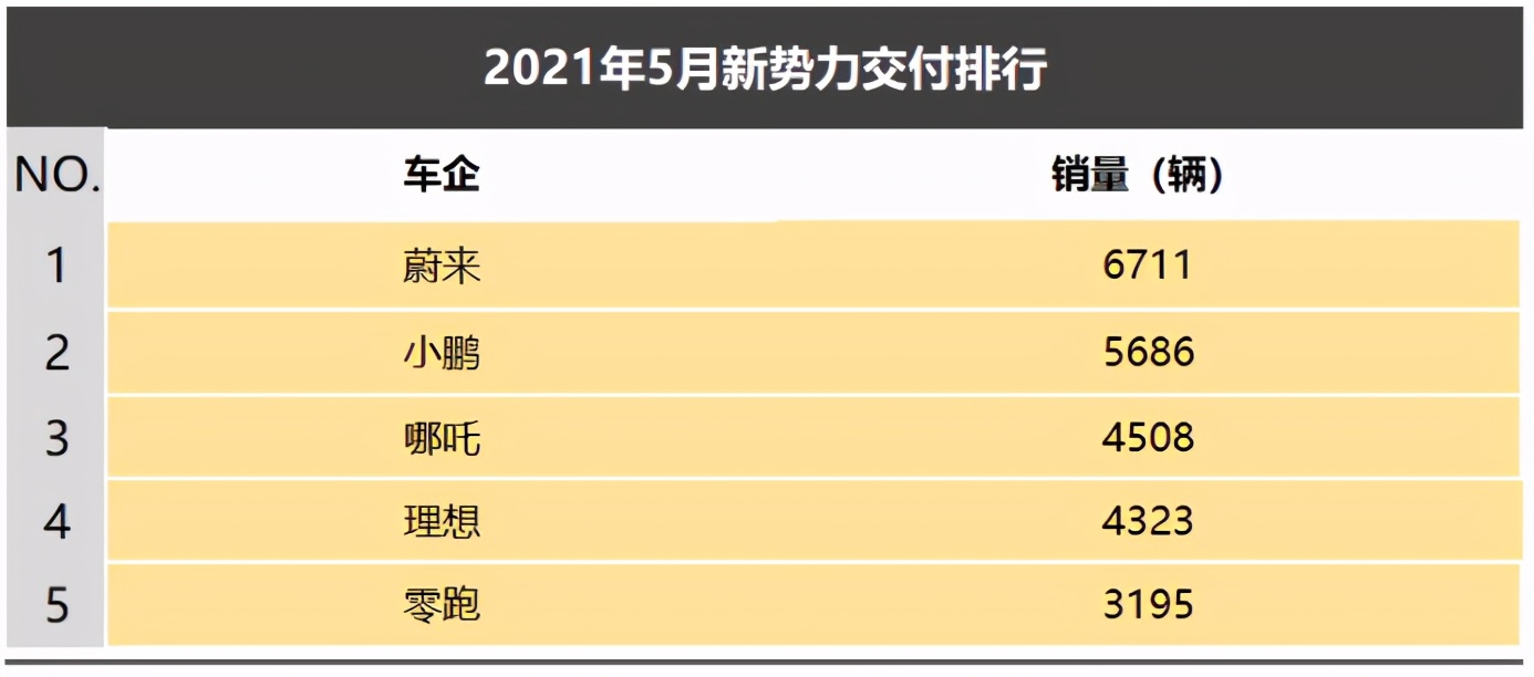通过新势力交付量排行榜可以看出,5月,二线“新势力”代表哪吒汽车交付量达到4508台,首次超越理想入围新势力销量榜单前三强。此外,排名第五的零跑交付量达到3195辆,同比大增1226%,环比增长15%,势头也非常强劲。