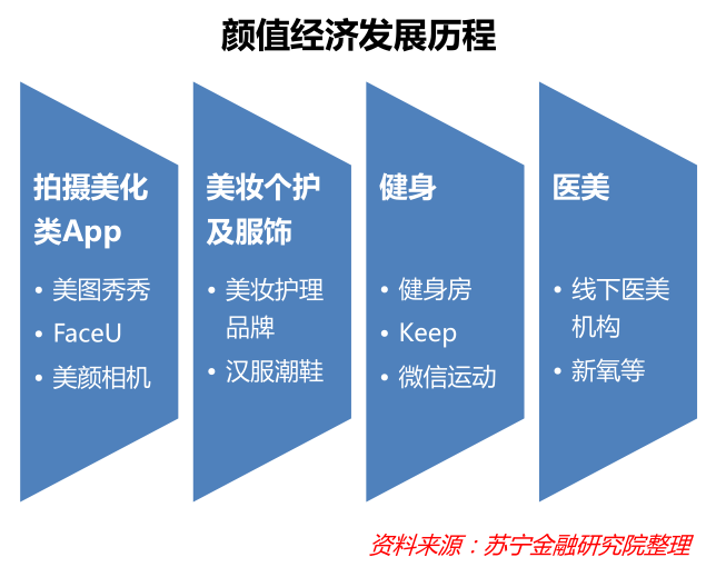 回溯发展历程,颜值经济大体经历了四个阶段,表现为对于颜值追求“从虚到实”的演进,个个都是巨大的风口。