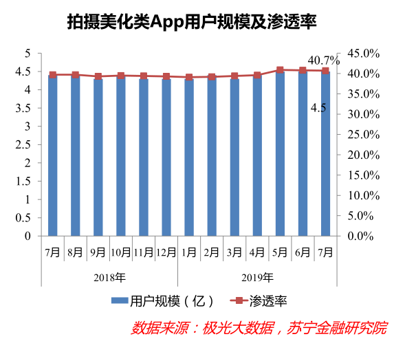 正因如此,拍摄美化类App非常受广大用户欢迎,有数据显示,2019年7月用户规模达4.5亿,渗透率达到40.7%,平均每10个移动互联网用户中,就有4个装有拍摄美化类App。