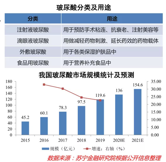 数据显示,我国玻尿酸市场规模从2015年的45.2亿元增长至2019年的136.0亿元,年复合增长率为27.5%,预计在2021年市场规模可达到154.6亿元。