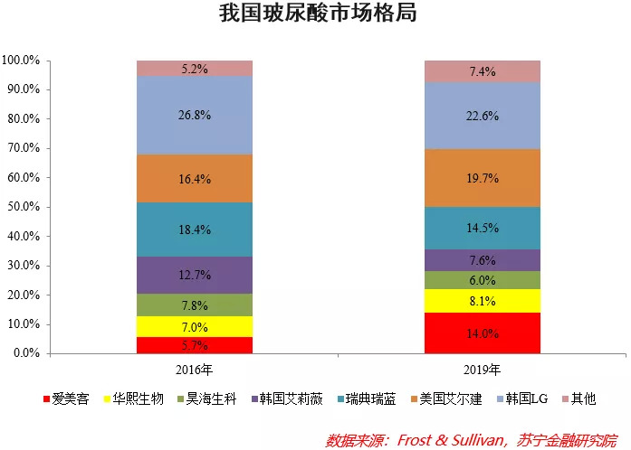 在本土品牌当中,以爱美客、华熙生物和昊海生科为代表的“玻尿酸三巨头”最具竞争力,三者合计占据的市场份额已从2016年的20.5%提升至2019年的28.1%。其中,爱美客的市占率从2016年的5.7%快速升至2019年的14%,华熙生物的市占率则由7%上升至8.1%。