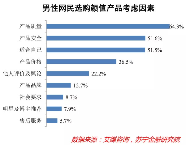 调查结果显示,男性消费者在选购颜值经济产品时,考虑因素的前四位分别是产品效果、产品安全、是否适合自己以及产品价格,整体表现出“务实”的消费特点。