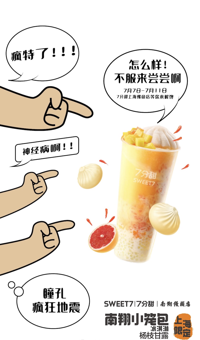 在营销方面,7分甜更加注重凸显品牌主打杨枝甘露以及芒果主题饮品的特色,以加强自身记忆点。比如,开启“城会玩”计划,根据每一座城市独特的饮食风俗推出城市限定版7分甜杨枝甘露。不久前,它在上海豫园店推出的限定产品“小笼包杨枝甘露”甚至上了微博热搜,相关话题阅读量过亿。品牌还与盒马鲜生进行联名合作,推出杨枝甘露主题甜品。