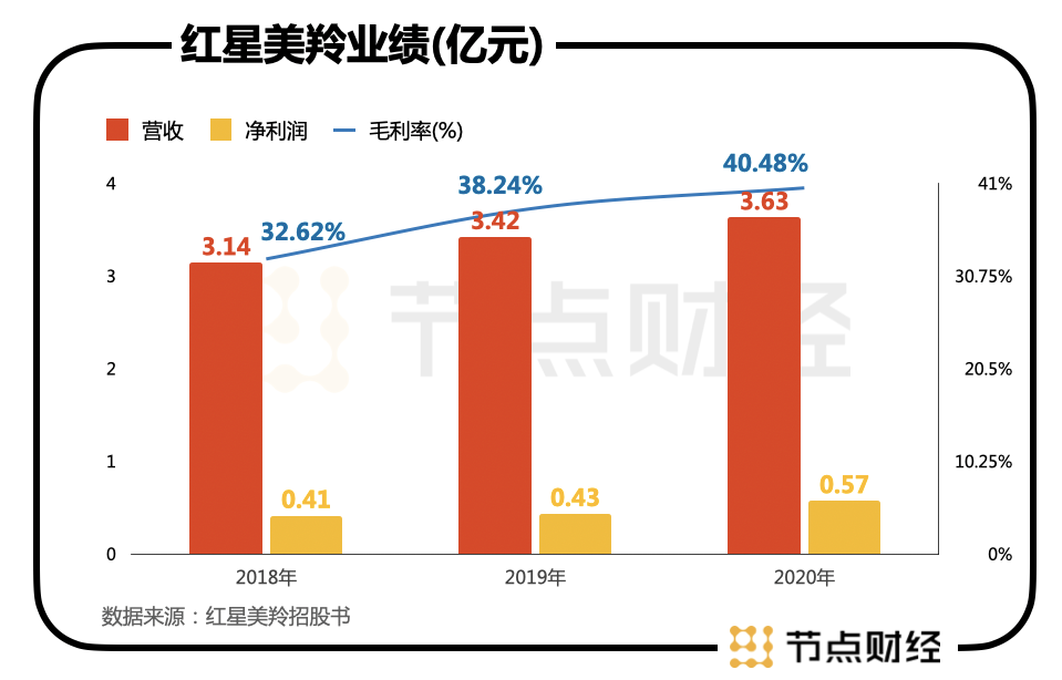 招股书显示,2018年-2020年报告期,红星美羚实现营业收入分别为3.14亿元、3.42亿元、3.63亿元,同比增长率为20.26%、8.66%、6.36%。