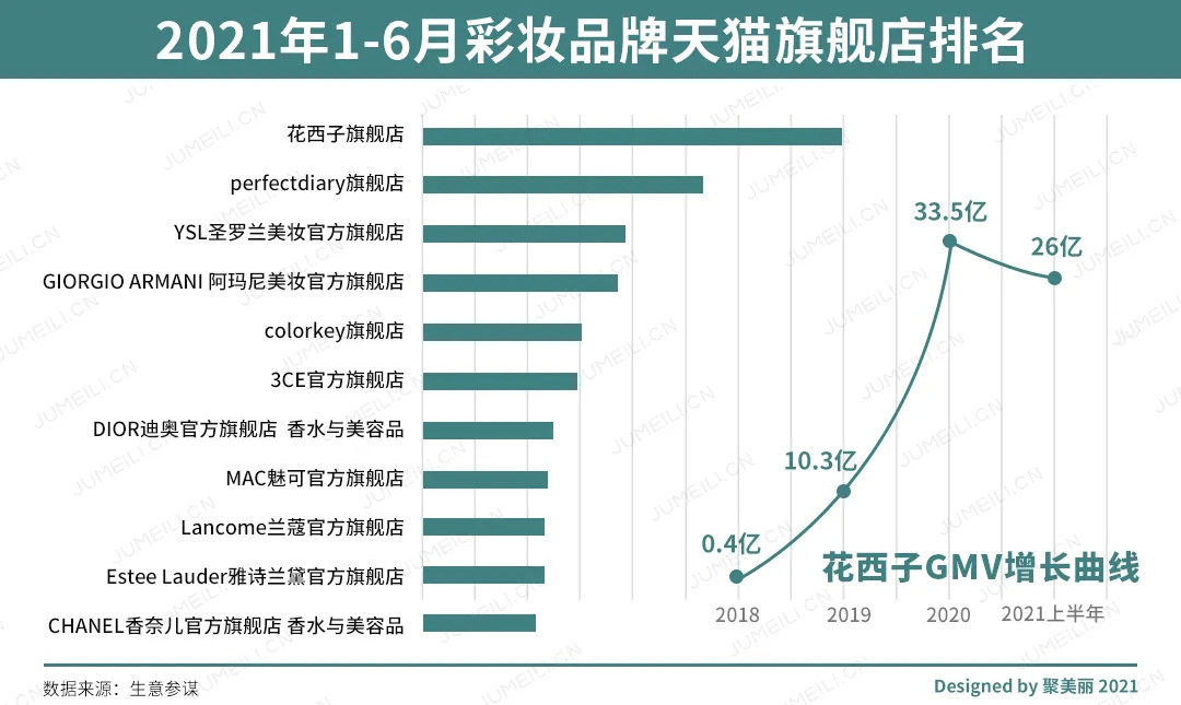 △2021年彩妆品牌天猫旗舰店排名,花西子历年GMV增长曲线