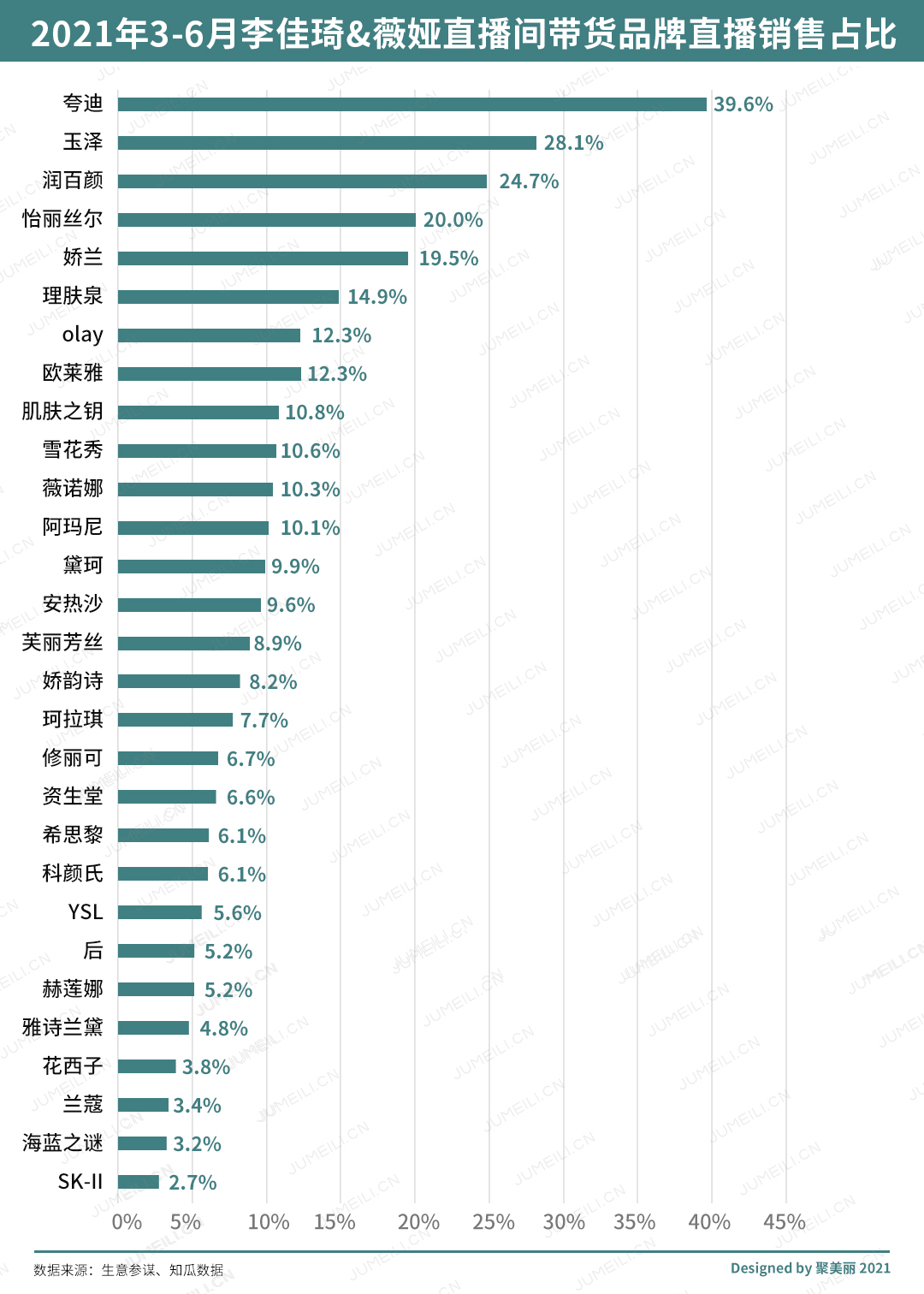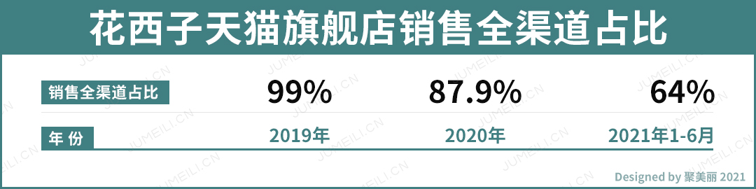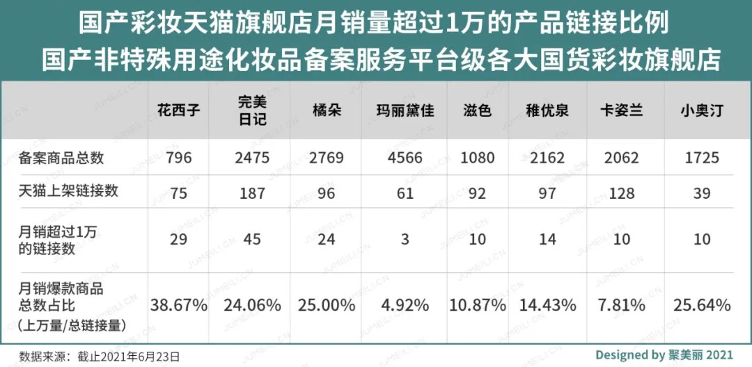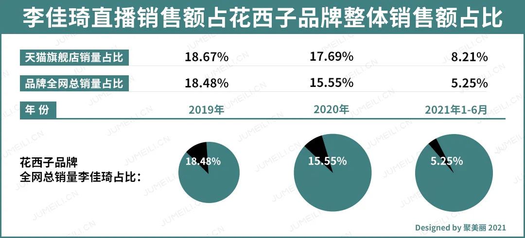而作为对比,聚美丽统计2021年3-6月(汇总至618活动期间)李佳琦与薇娅直播间带货品牌直播销量,与当期天猫旗舰店总销量占比,我们会看到花西子其实属于“占比非常低”之列: