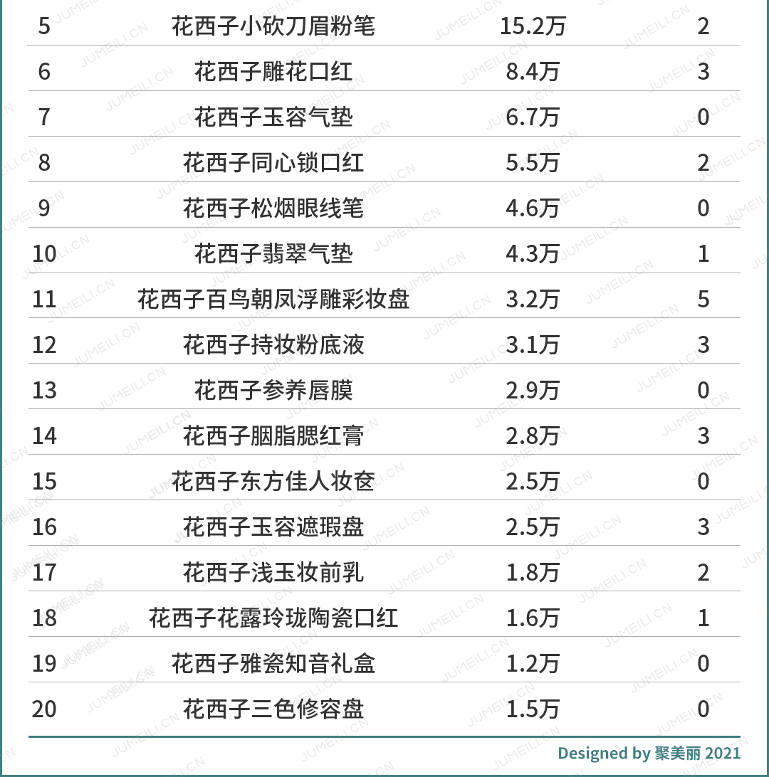 在这样的努力下,在刚刚过去的5月份,统计天猫彩妆17个类目中月销售额TOP20的产品链接数就能发现,花西子足足占领了25个,远超国内国际彩妆品牌。
