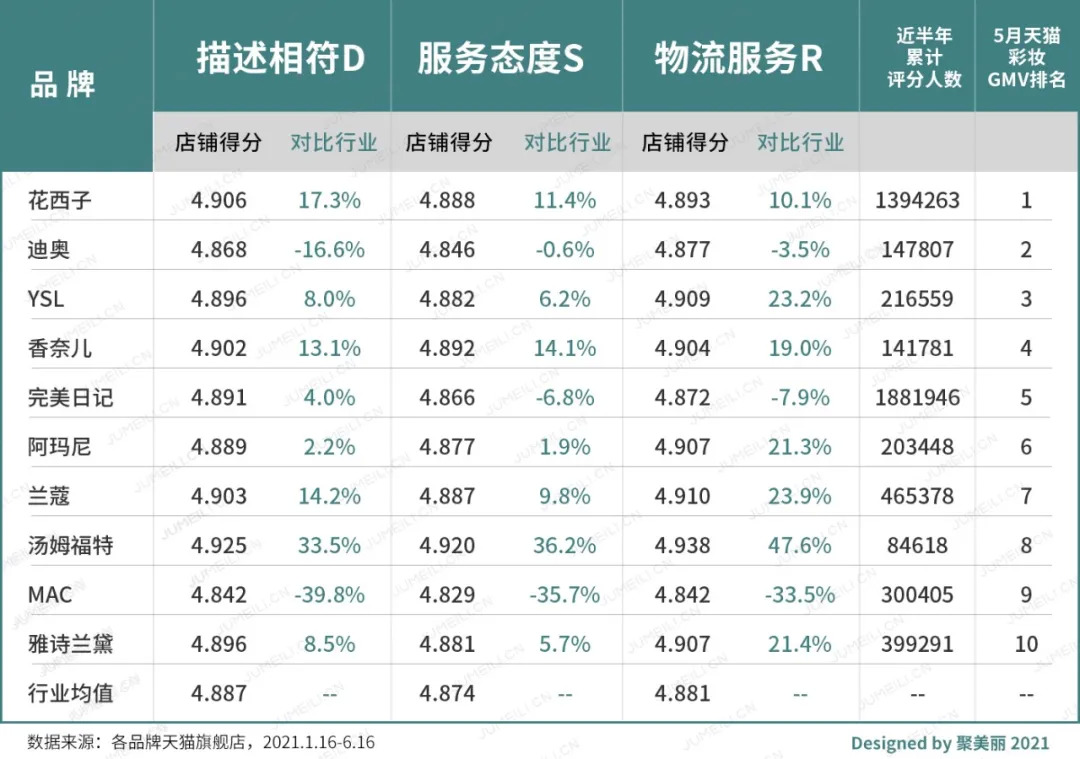 再从店铺评分看,美妆品类国际大牌的店铺DSR区间基本在4.7-4.9。据统计至2021年6月16日的最新5个月的数据表明,花西子旗舰店DSR评分远高于行业平均分。其中最能够呈现产品质量的“描述相符”评分高于行业平均值17.3%,服务评分高于行业平均值11.4%,物流评分高于行业平均值10.1%。