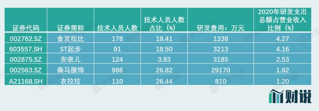 虚拟经营模式下,童装企业对生产和销售环节掌控能力弱,核心竞争力更依赖于产品研发、设计能力,但从研发投入看,衣拉拉甚至还低于同业。2020年末,衣拉拉技术人员数110人,绝对数低于大部分同业。2020年公司研发费用810万元,研发支出绝对数和研发支出占营业收入比例均大幅低于同业公司。