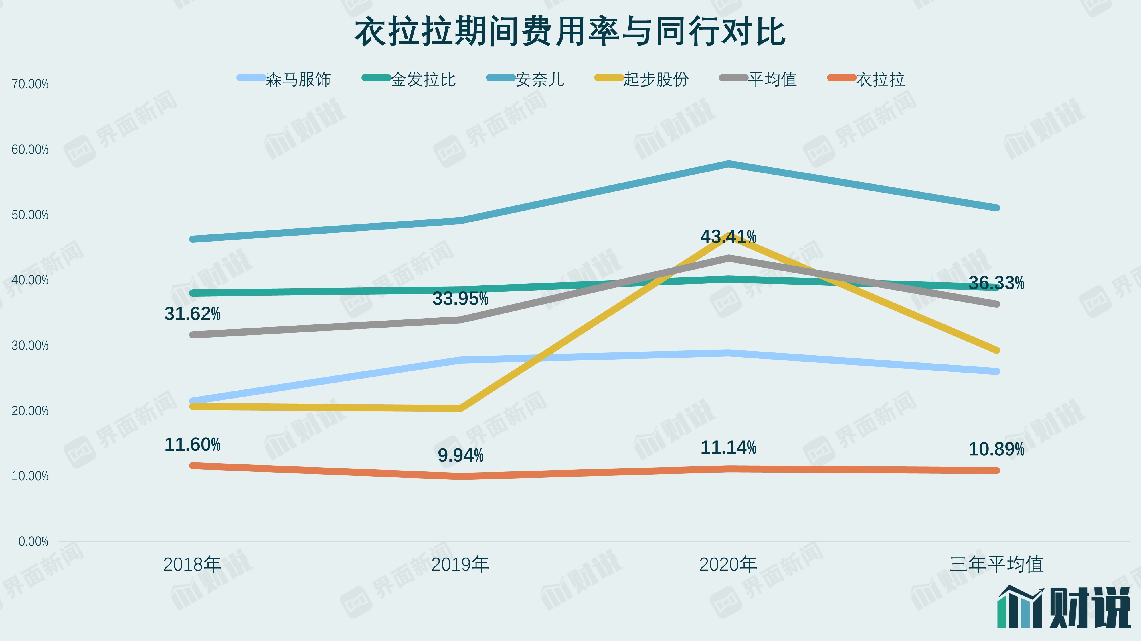 “低毛利高净利”最直接原因是期间费用率压缩。2018年—2020年,森马服饰(balabala)、ST起步(ABCkids)、安奈儿、金发拉比四家可比公司期间费用率均值为36.33%,而同期衣拉拉期间费用率仅为10.89%。