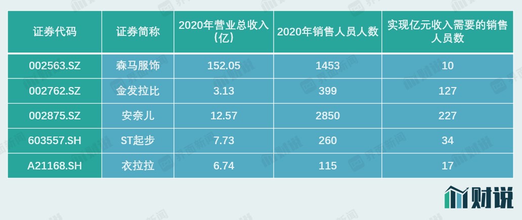 对于下游销售衣拉拉采用经销为主模式,2018年—2020年,衣拉拉通过经销模式实现收入占主营业务收入比例分别为81.45%、80.08%和83.11%,可比公司则主要采用直营和加盟门店销售为主。经销模式不用自建销售渠道,销售费用率也低于可比公司。从每亿元收入需要配置销售人员数来看,衣拉拉仅需要17人,大幅低于相近营收规模可比公司金发拉比、安奈儿、ST起步。