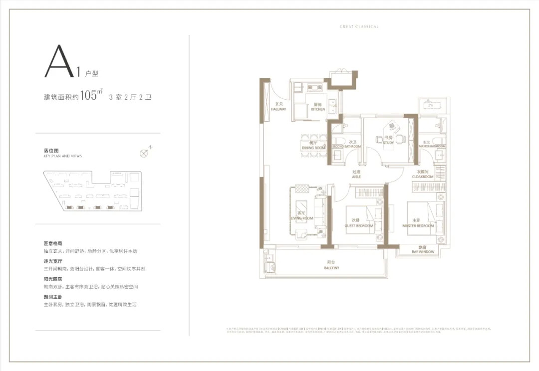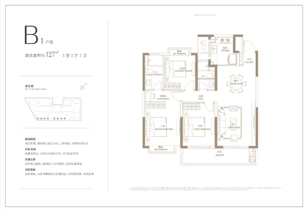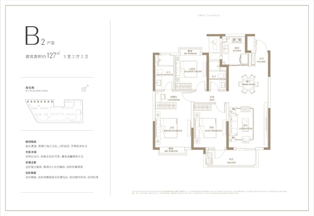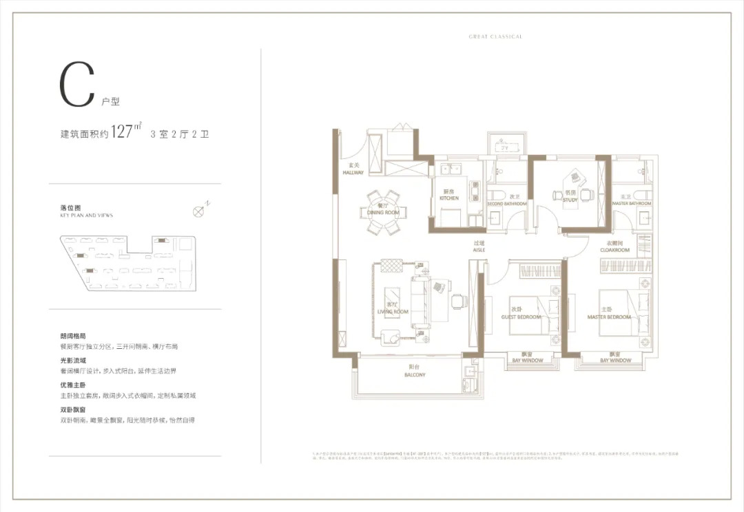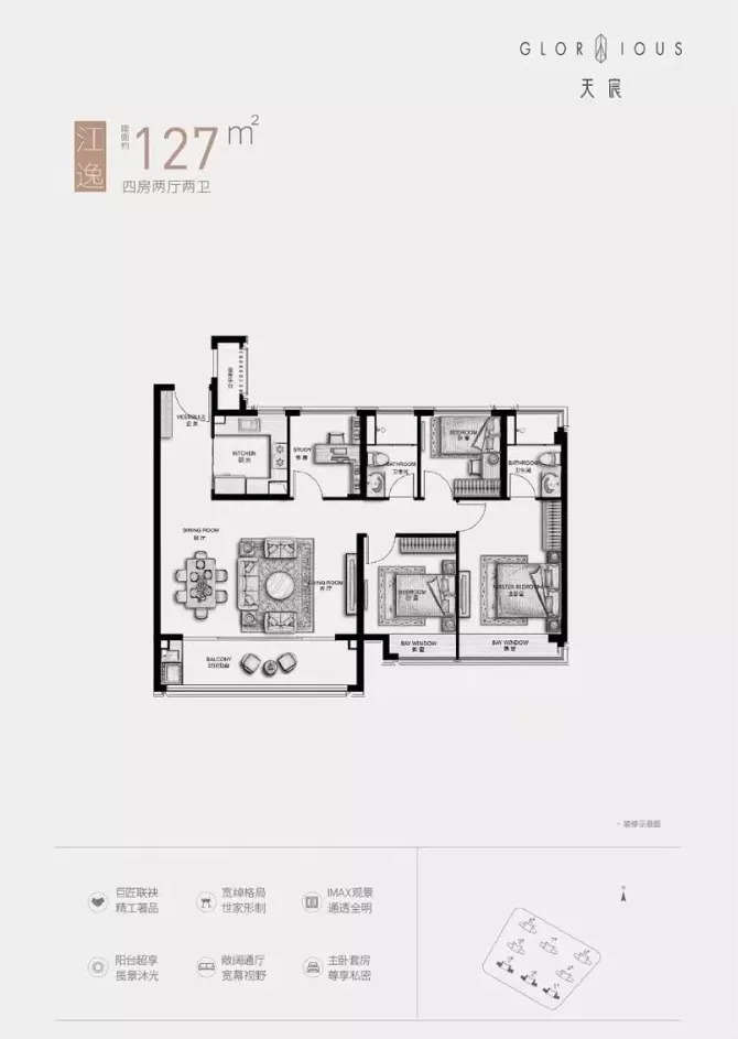 天宸江樾建面约127㎡的户型为四房两厅两卫设计,三开间朝南,且客厅采用横厅设计,采光、通风性能好,南向卧室均带飘窗,功能布局非常齐全。