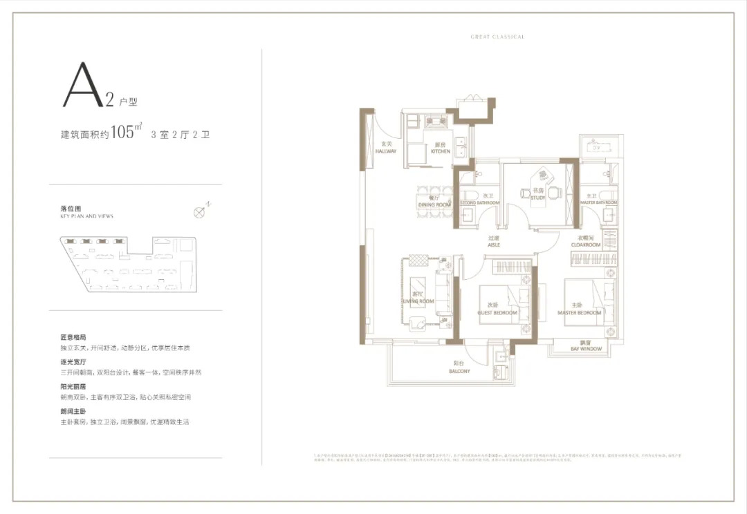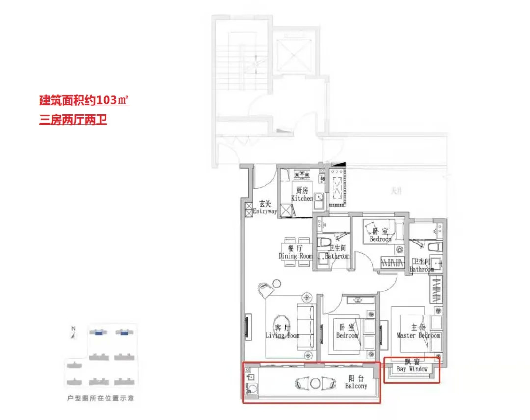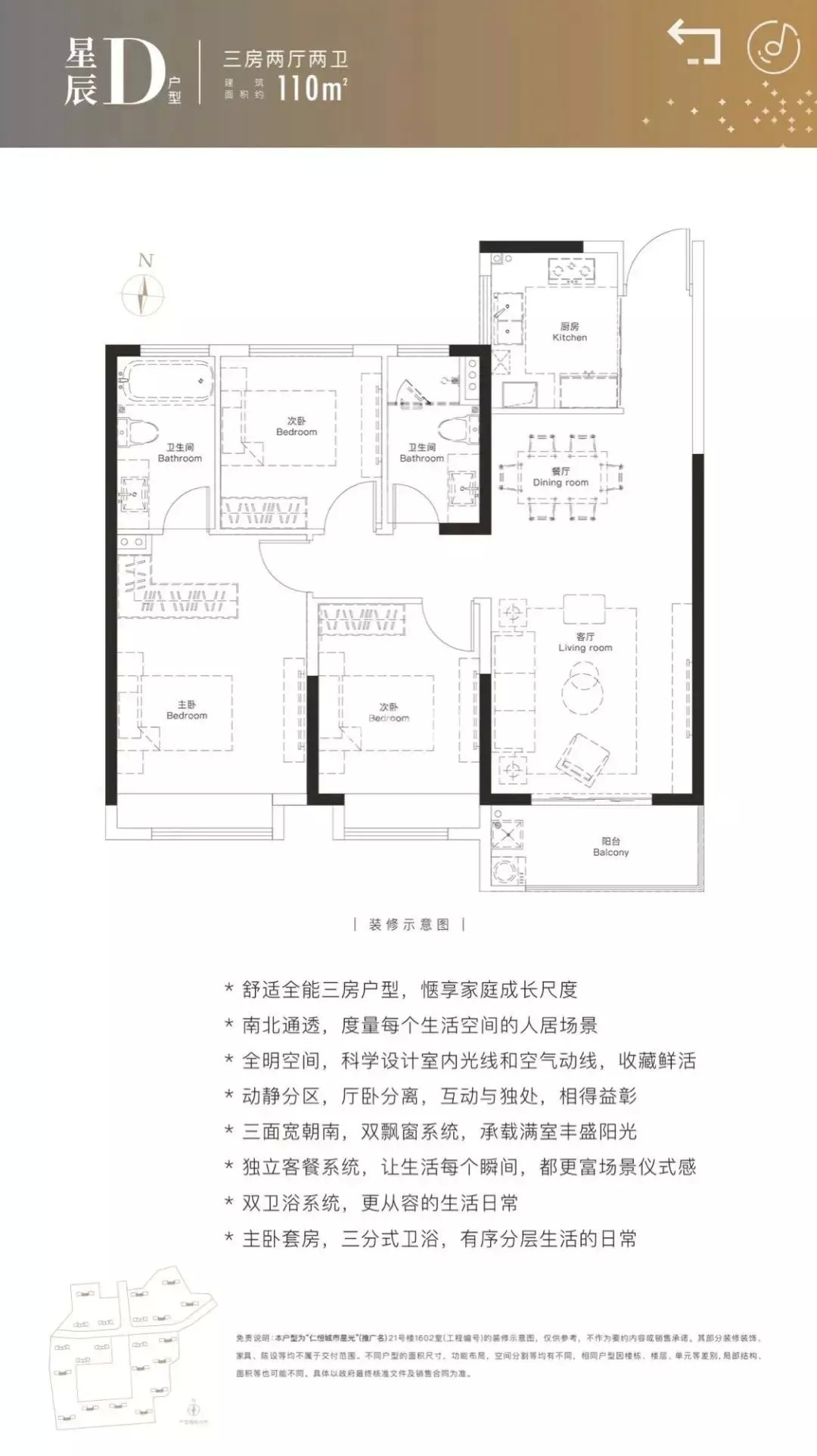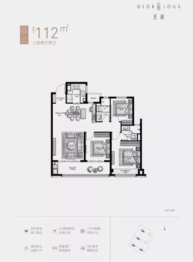 天宸云筑建面约112㎡为三房两厅两卫设计,三开间朝南,客厅与南向次卧连通大阳台,主卧带独立卫生间,居住舒适性高。