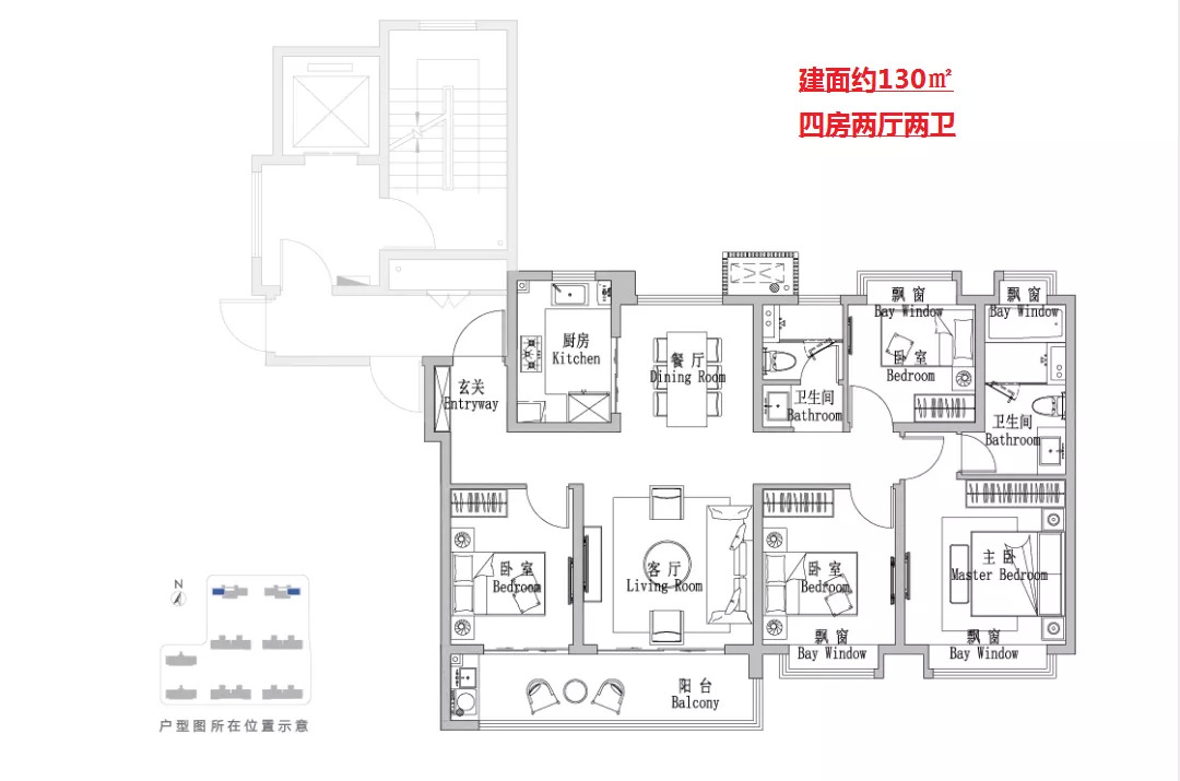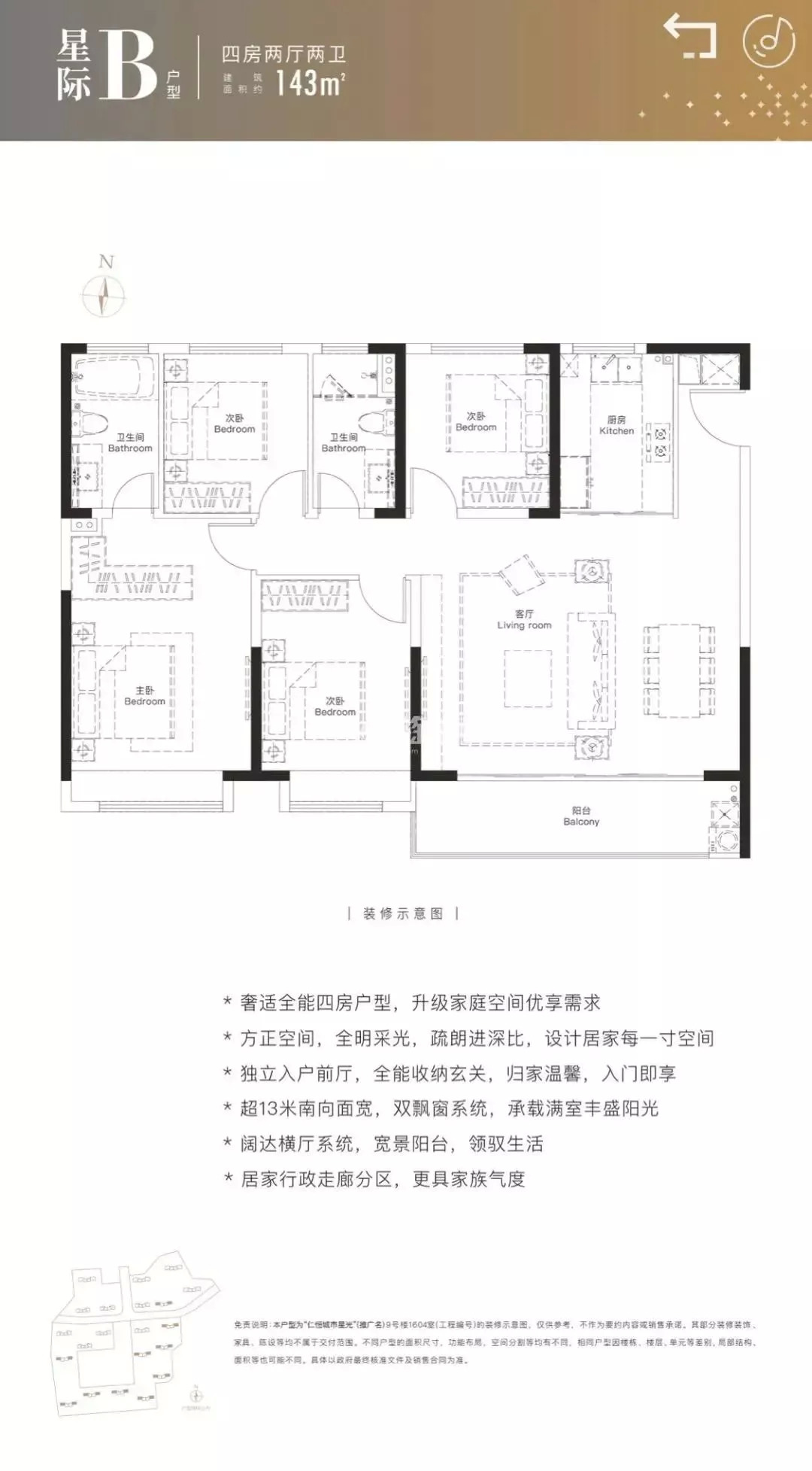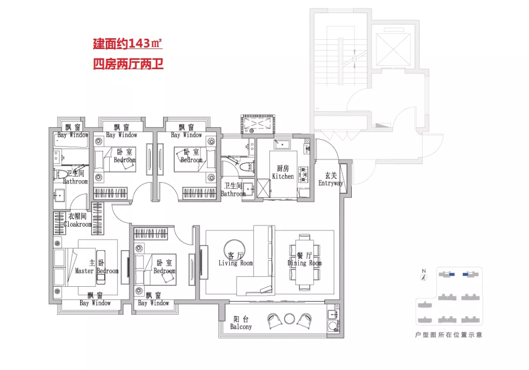 建面约 143㎡4房2厅2卫 户型