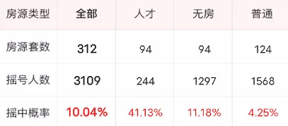 本次摇号共计吸引了3109组购房者参与摇号(其中人才244组,无房1297组,普通1568组),2个半小时312套房源全部售罄,综合中签率约10.04%,超2700人陪跑!
