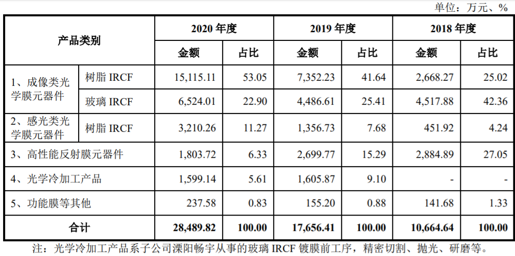 报告期内,公司收入主要来自手机摄像头模组用成像类光学膜元器件、手机和平板电脑用感光类光学膜元器件,两者合计收入占比逐年上升,分别为71.62%、74.74%和87.22%。