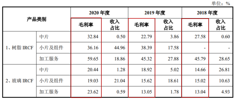 值得一提的是,报告期内,京浜光电树脂IRCF毛利率远高于玻璃IRCF的毛利率,由于树脂IRCF收入占比从 2018年的29.25%上升至2020年的64.32%,导致综合毛利率也不断攀升,分别为26.17%、28.99%、35.54%。