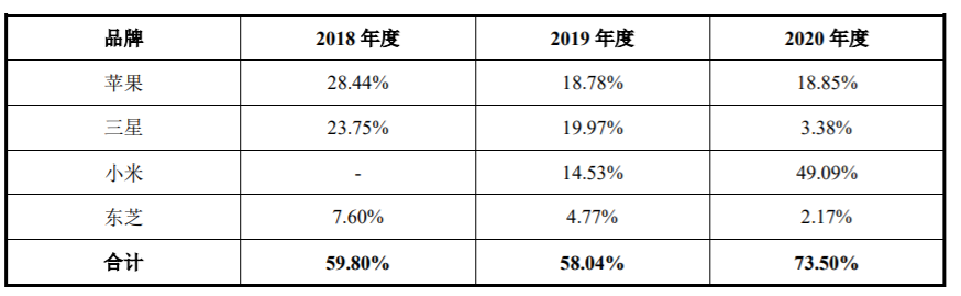 在前述的产品应用终端客户中,京浜光电与苹果的终端合作可能存在很大不确定性,但是与小米的合作却持续上升,公司产品应用到小米的收入占比由2019年的14.53%猛增到2020年的49.09%,而2020年苹果、三星、小米和东芝四大终端品牌的收入占比才73.50%。