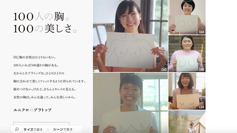 这个“100位女性的胸部,100种美丽”的广告专题并不是宣传达女人的胸有多美丽,而是希望告诉你,无论你的胸长什么样,都适合穿优衣库的内衣上衣Bratop系列产品。