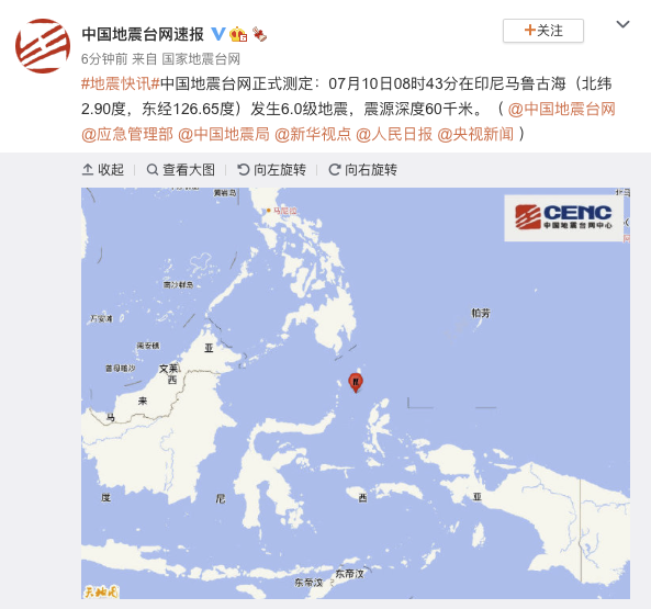 中国地震台网速报 微博消息,中国地震台网正式测定:07月10日08时43分在印尼马鲁古海(北纬2.90度,东经126.65度)发生6.0级地震,震源深度60千米。