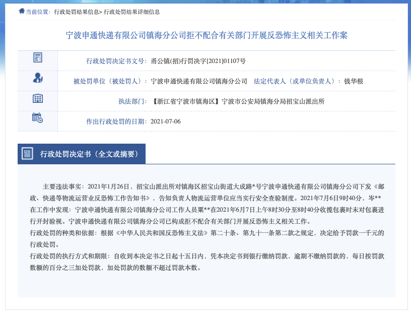据浙江政务服务网消息,7月6日,宁波申通快递有限公司镇海分公司因拒不配合有关部门开展反恐怖主义相关工作被行政处罚,罚款一千元。执法部门为宁波市公安局镇海分局招宝山派出所。主要违法事实为,2021年1月26日,招宝山派出所对镇海区招宝山街道大成路*号宁波申通快递有限公司镇海分公司下发《邮政、快递等物流运营业反恐怖工作告知书》,告知负责人物流运营单位应当实行安全查验制度。2021年7月6日9时40分,岑**在工作中发现:宁波申通快递有限公司镇海分公司工作人员粟**在2021年6月7日上午8时30分至8时40分收揽包裹时未对包裹进行开封验视。宁波申通快递有限公司镇海分公司已构成拒不配合有关部门开展反恐怖主义相关工作。