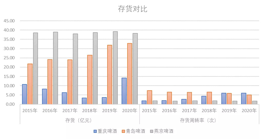 存货是业绩表现不佳的一个重要原因。从三家啤酒企业近年来存货和存货周转率对比来看,虽然燕京啤酒营收远小于青岛啤酒,但存货却一直高于青岛啤酒,历年都在37亿元以上,居高不下。而且燕京啤酒存货周转率在三家企业中最低,2020年仅有1.71次,远低于重庆啤酒的6.06次和青岛啤酒的5.12次。
