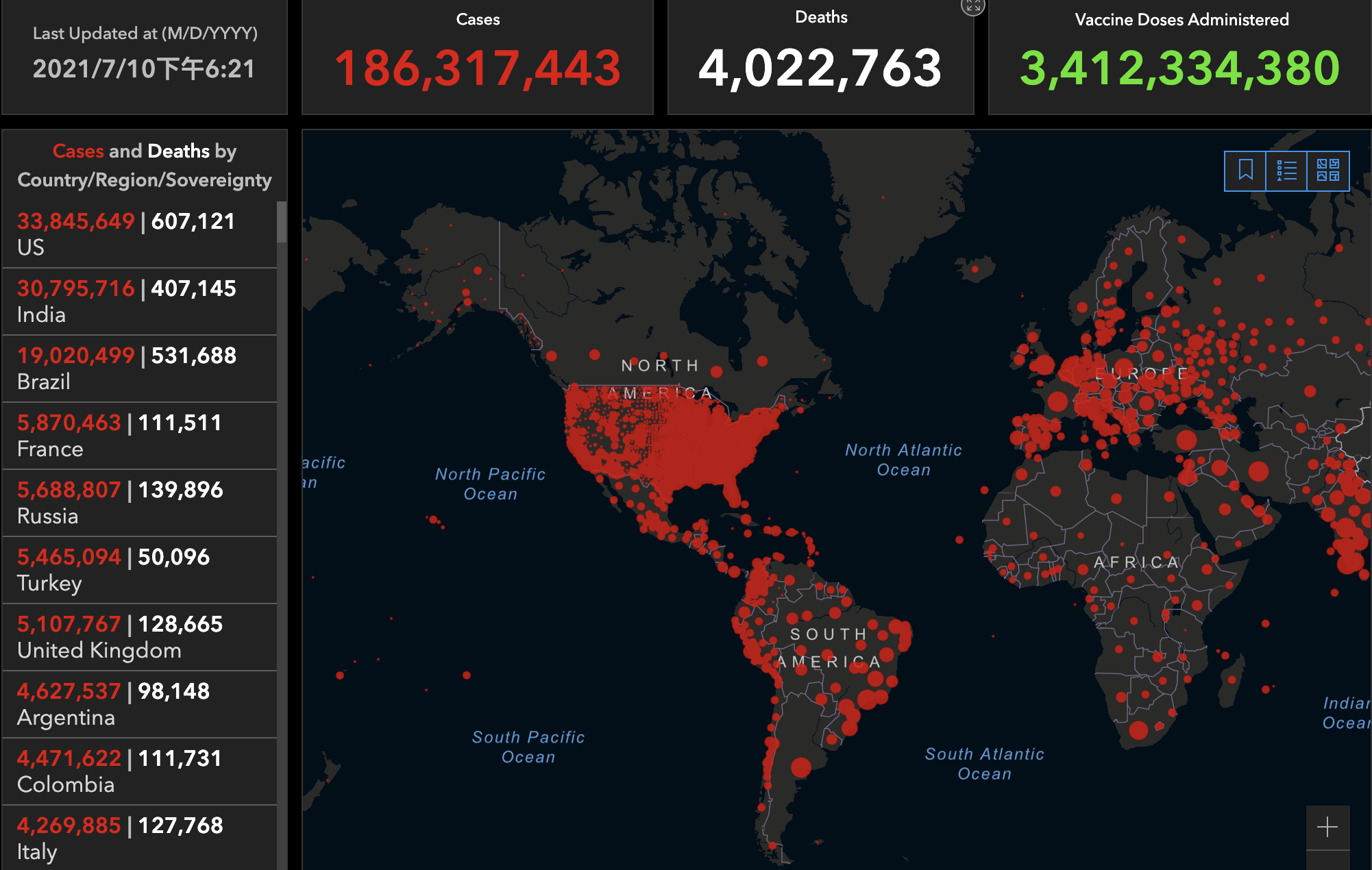 据约翰斯·霍普金斯大学的疫情追踪数据,截至北京时间7月11日上午8点30分,全球累计确诊新冠肺炎病例186317443例,累计死亡4022763例,接种疫苗超34.1亿剂次。