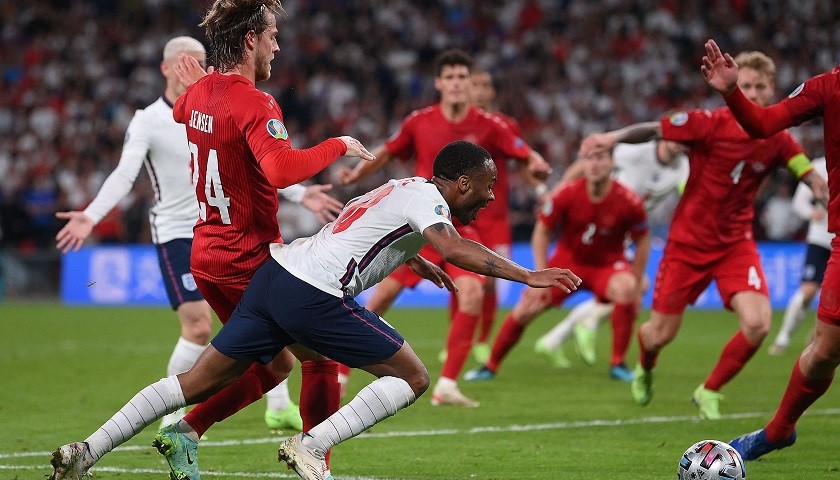 在半决赛的加时鏖战中,斯特林带球强势突入禁区,因丹麦球员的干扰而倒地,裁判判罚点球。