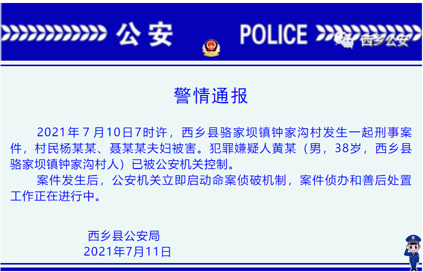 据陕西汉中西乡公安7月11日通报,7月10日7时许,西乡县骆家坝镇钟家沟村发生一起刑事案件,村民杨某某、聂某某夫妇被害。犯罪嫌疑人黄某(男,38岁,西乡县骆家坝镇钟家沟村人)已被公安机关控制。案件发生后,公安机关立即启动命案侦破机制,案件侦办和善后处置工作正在进行中。