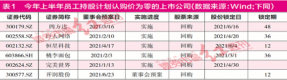 在认购价方面,当下的员工持股计划和股权激励计划越来越相似。根据《上市公司股权激励管理办法》,“上市公司在授予激励对象限制性股票时,应当确定授予价格或授予价格的确定方法。授予价格不得低于股票票面金额,且原则上不得低于下列价格较高者:(一)股权激励计划草案公布前1个交易日的公司股票交易均价的50%;(二)股权激励计划草案公布前20个交易日、60个交易日或者120个交易日的公司股票交易均价之一的50%。上市公司采用其他方法确定限制性股票授予价格的,应当在股权激励计划中对定价依据及定价方式作出说明”。而目前上市公司员工持股计划的员工认购价多为格力电器式的五折转让,1元/股的员工认购价也不在少数,部分公司的员工更是以零对价受让公司股份(见表1)。而这部分员工认购的股份一旦解禁,这些公司的股价将面临抛售的压力。